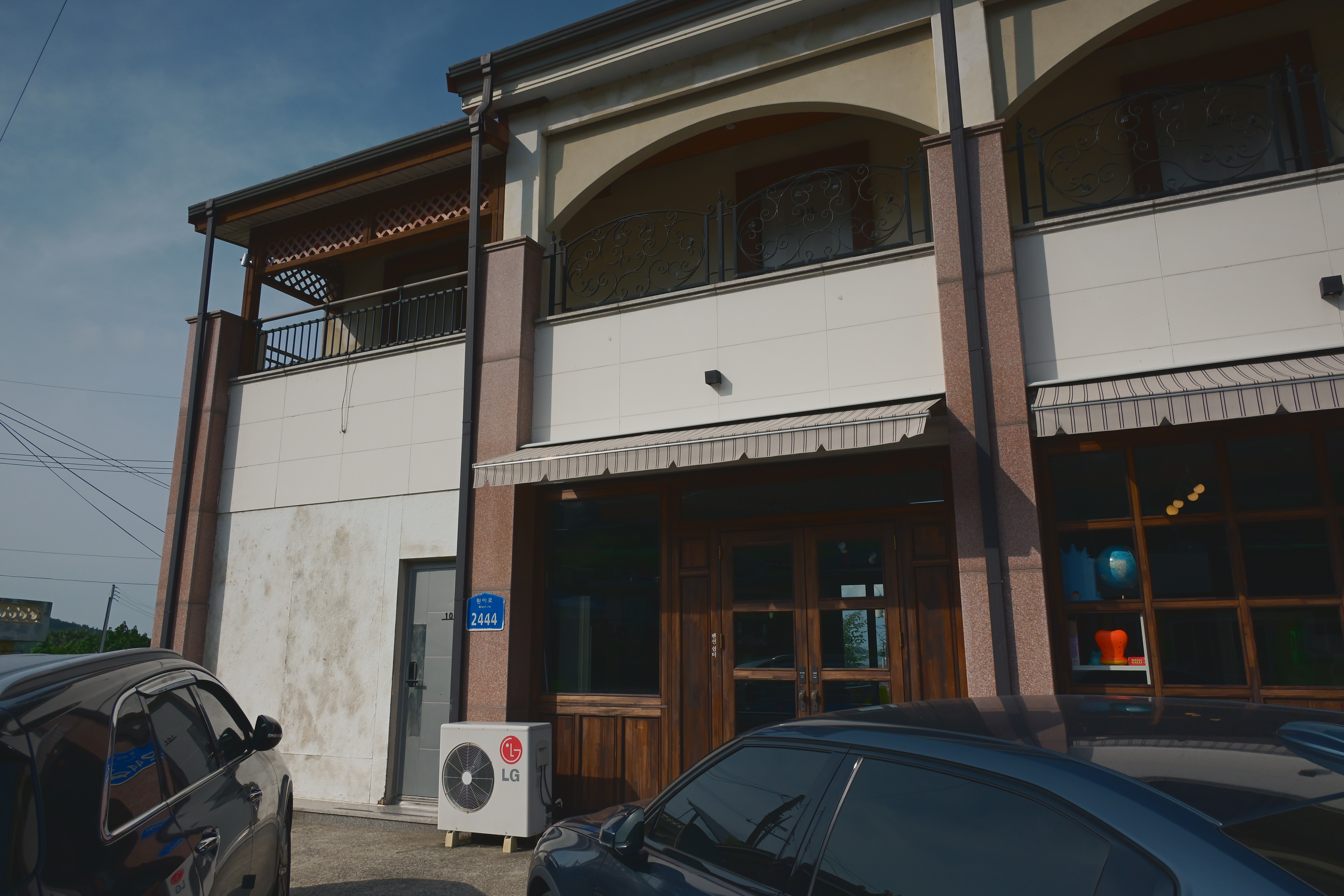 모던한 외관과 도로변에 가까운 주차장,